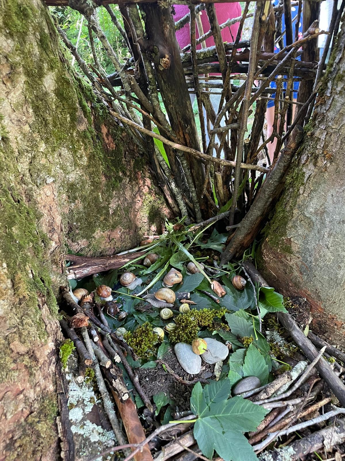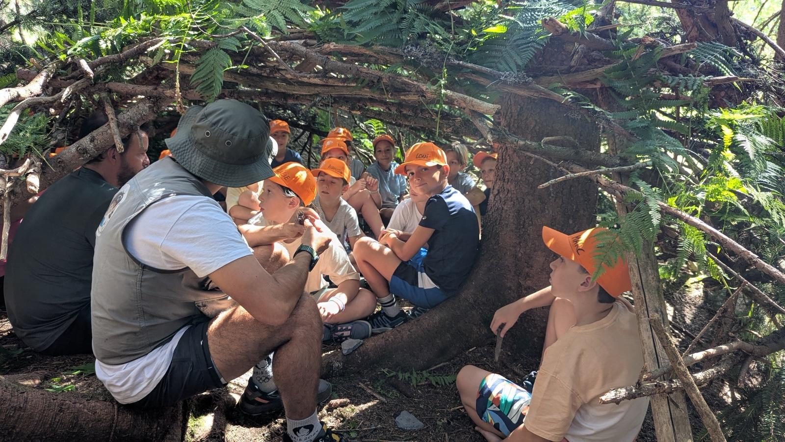 Making huts in the woods, by recovering what is on the ground, branches, foliage, stones, trunks, a real interesting team work. For all !